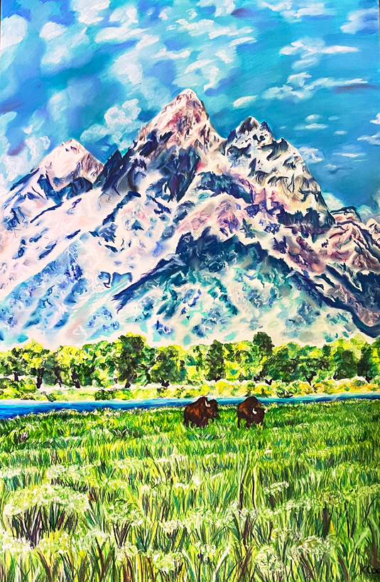 Bison in the Tetons Framed Pastel Drawing 24×36″ 2024